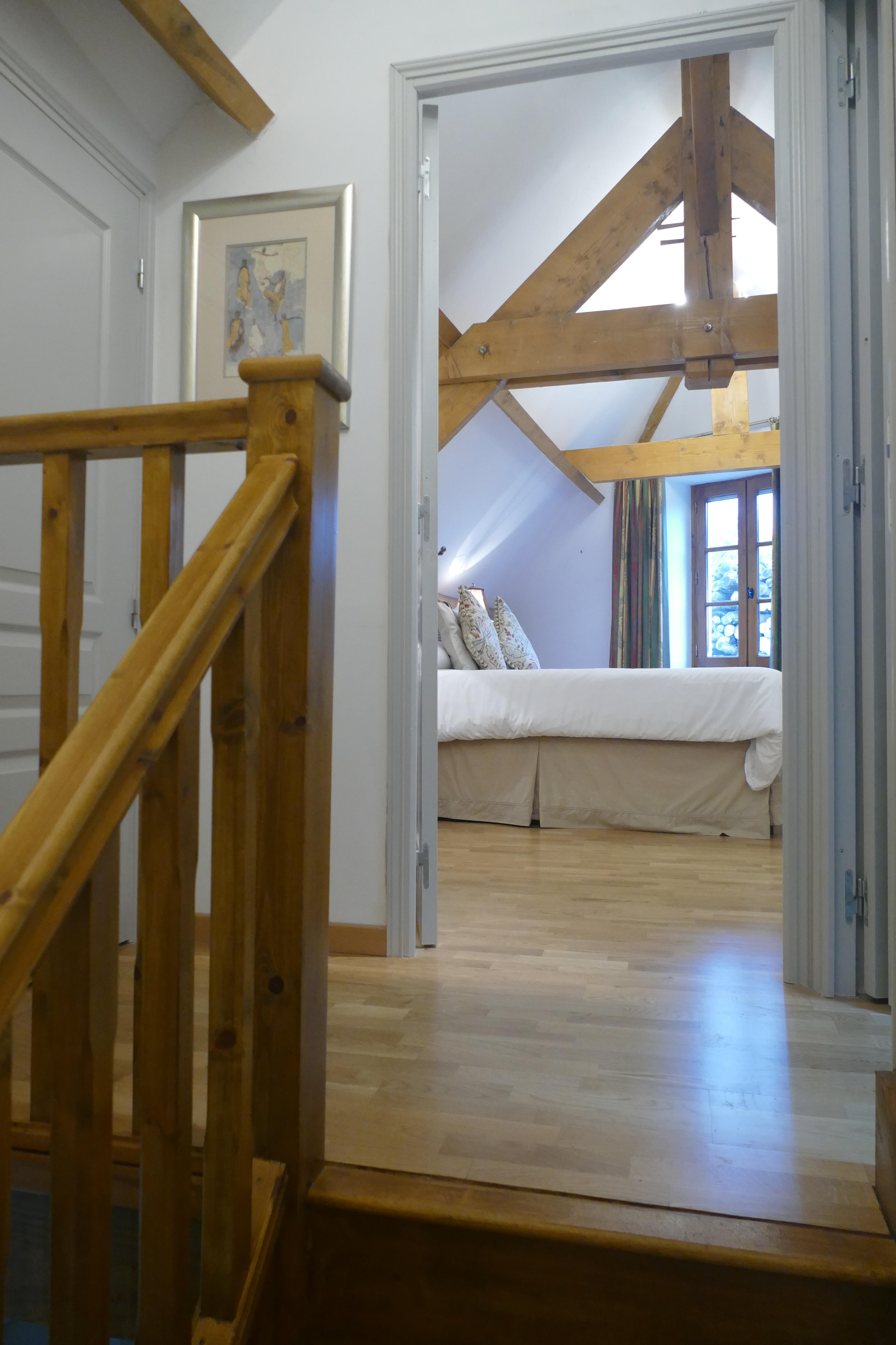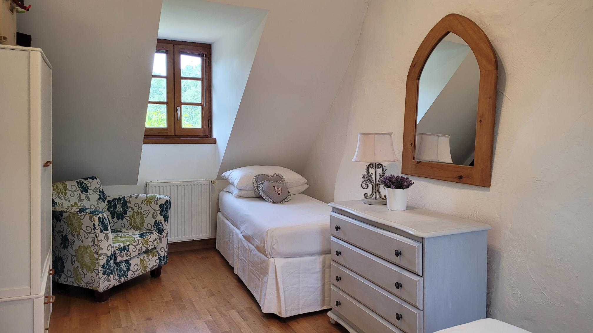 - Chambre 4 Lit double (135cm), lit simple, tables de chevet, penderie, fauteuil, 2 fenêtres, ouverte sur les chevrons, mur en pierre (cette chambre peut être jumelle)