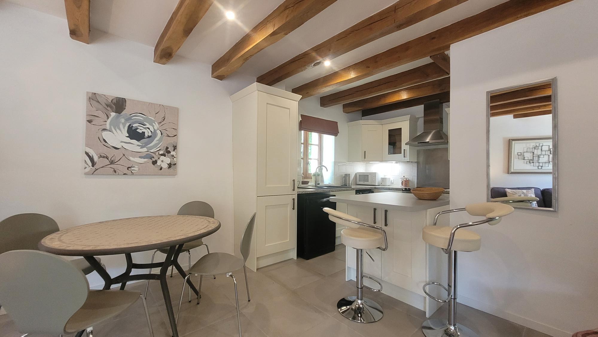 - Cuisine : cuisine séparée pour le petit-déjeuner avec grande table en pierre calcaire et 6 chaises, cuisinière Smeg (four électrique et plaque de cuisson au gaz), hotte aspirante, réfrigérateur/congélateur intégré, micro-ondes, évier unir, placards et étagères , grille-pain, cafetière Nespresso, bouilloire. A l'extérieur une petite terrasse surélevée