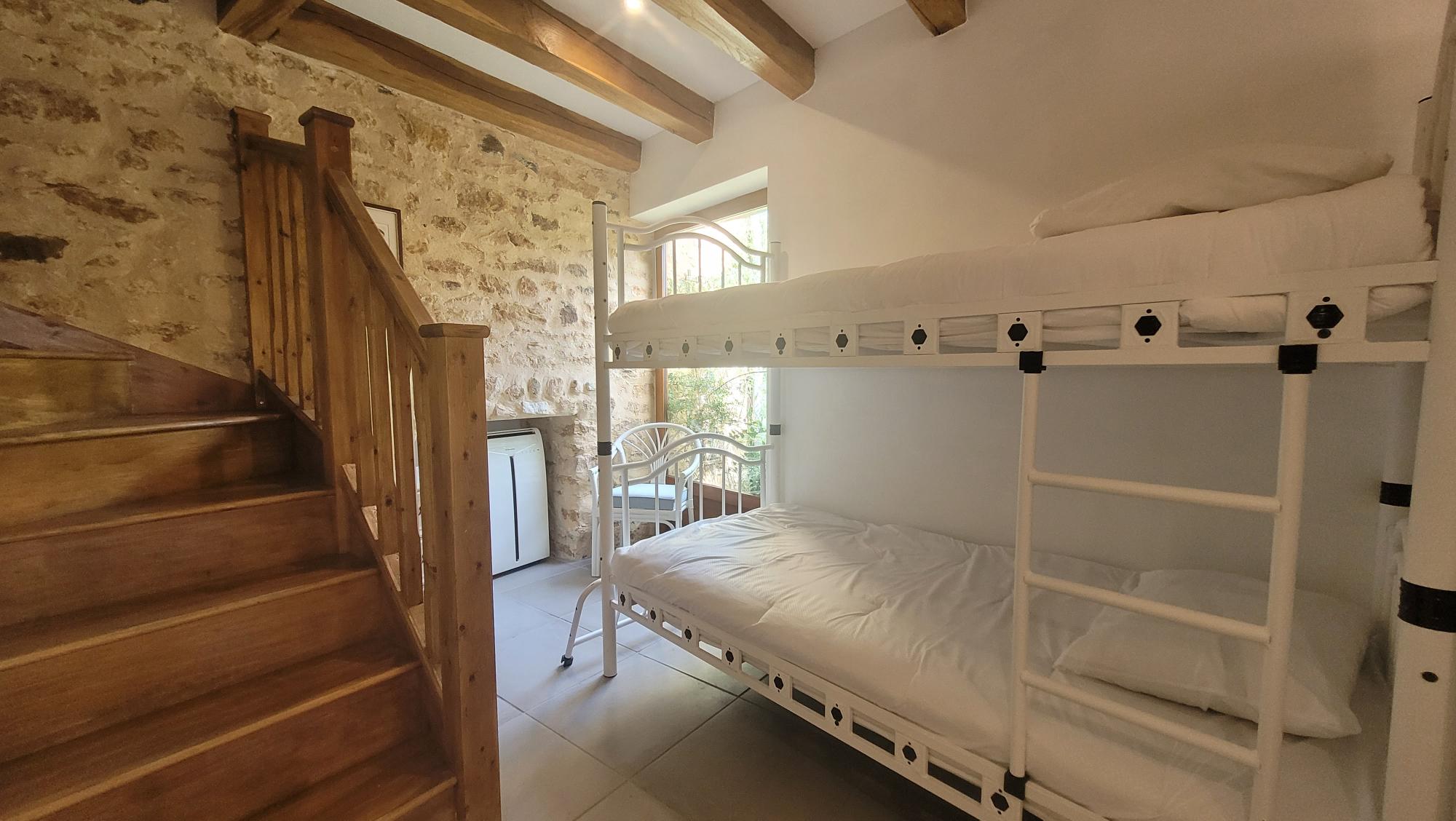 - Lits superposés avec une petite armoire et une table de chevet