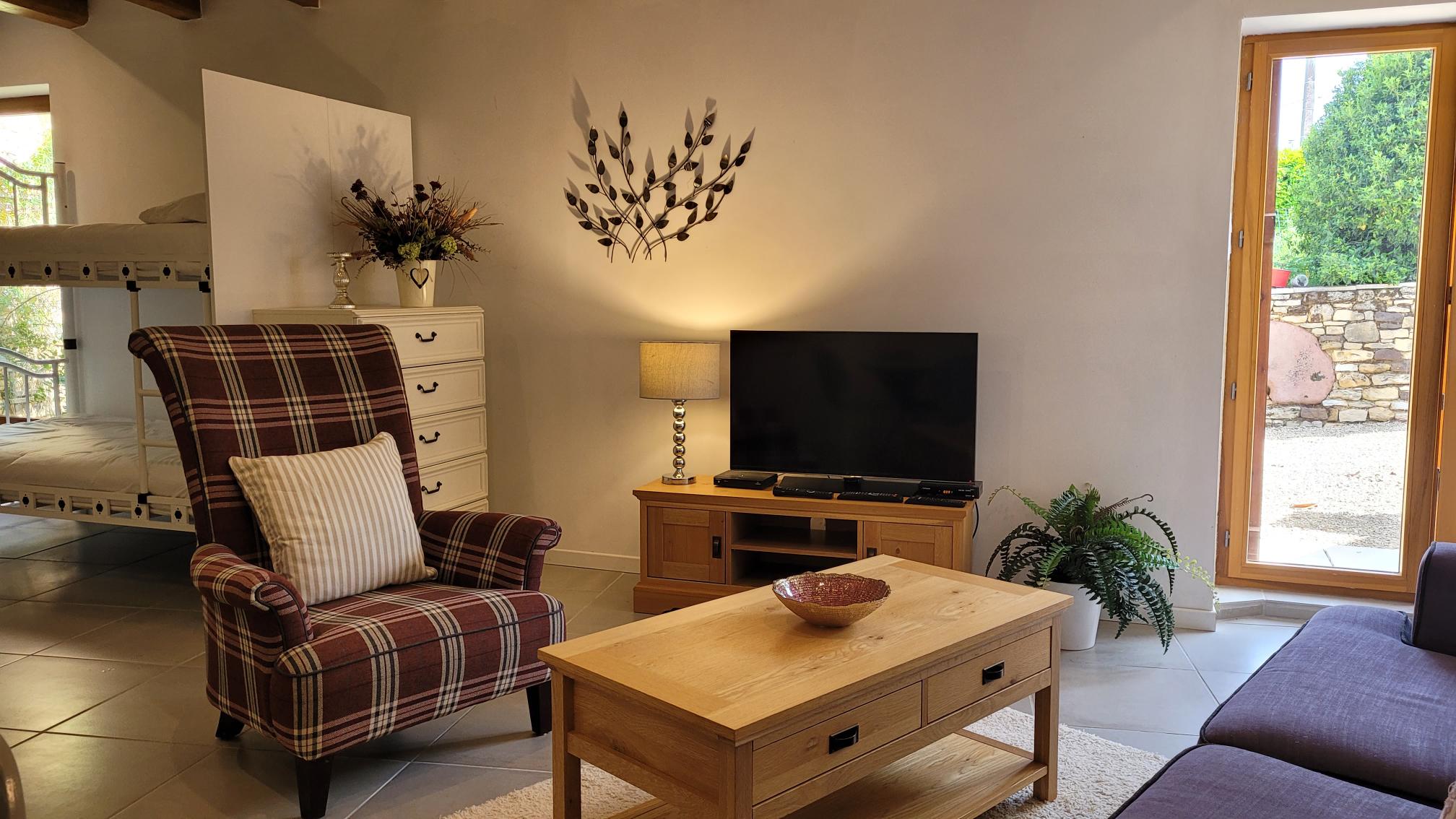 - Il y a un canapé, un fauteuil, des tables, des armoires de rangement, des lampes, une télévision à écran plat avec des programmes en français et en anglais. La salle à manger se trouve dans ce même espace et dispose d'une jolie table ronde avec 4 chaises . L'accès au jardin se fait par un portail .