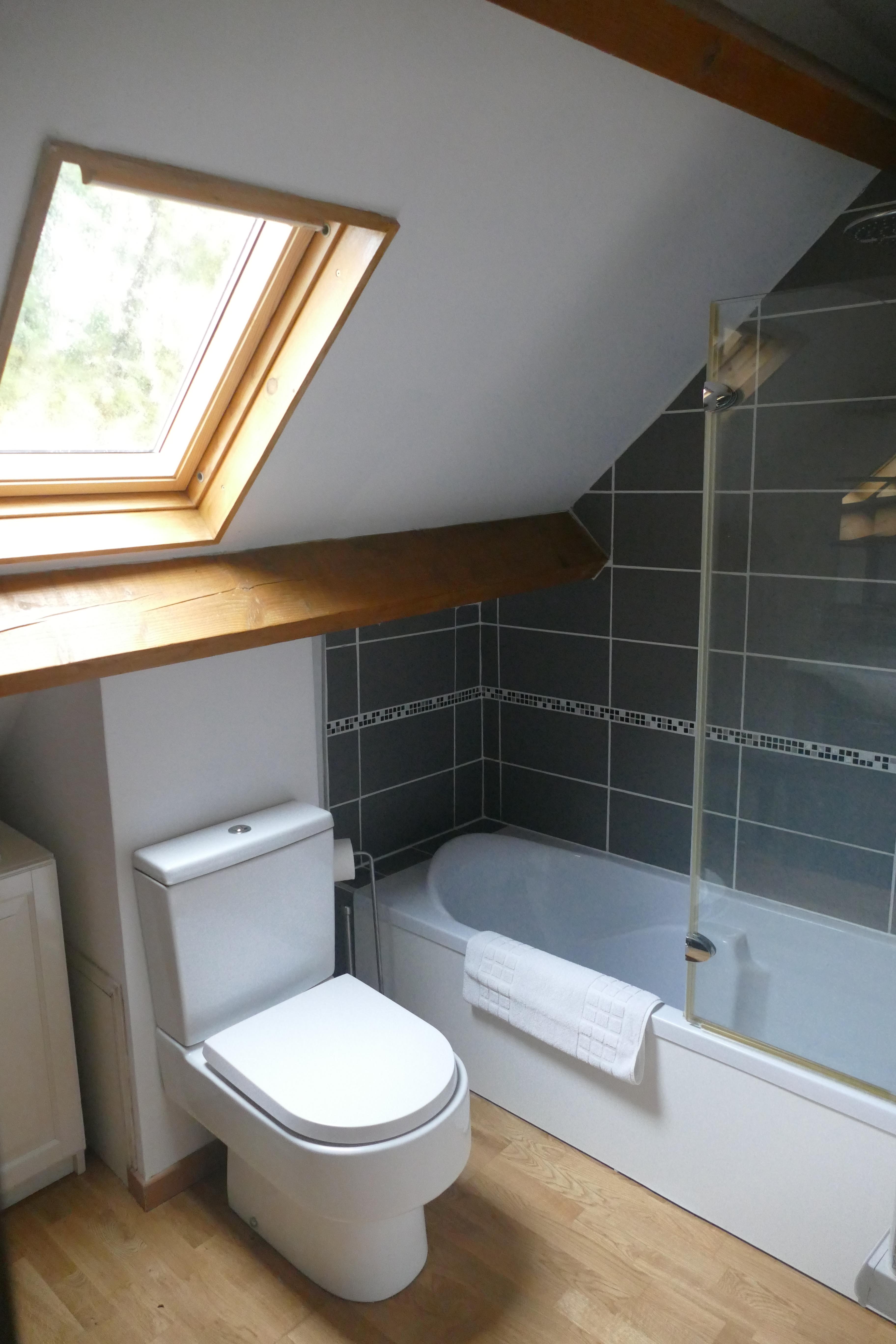 - Salle de bain - Baignoire d'angle avec douchette et pare-douche, meuble vasque, WC, sèche-serviettes, miroir - Entre les chambres 4 et 5