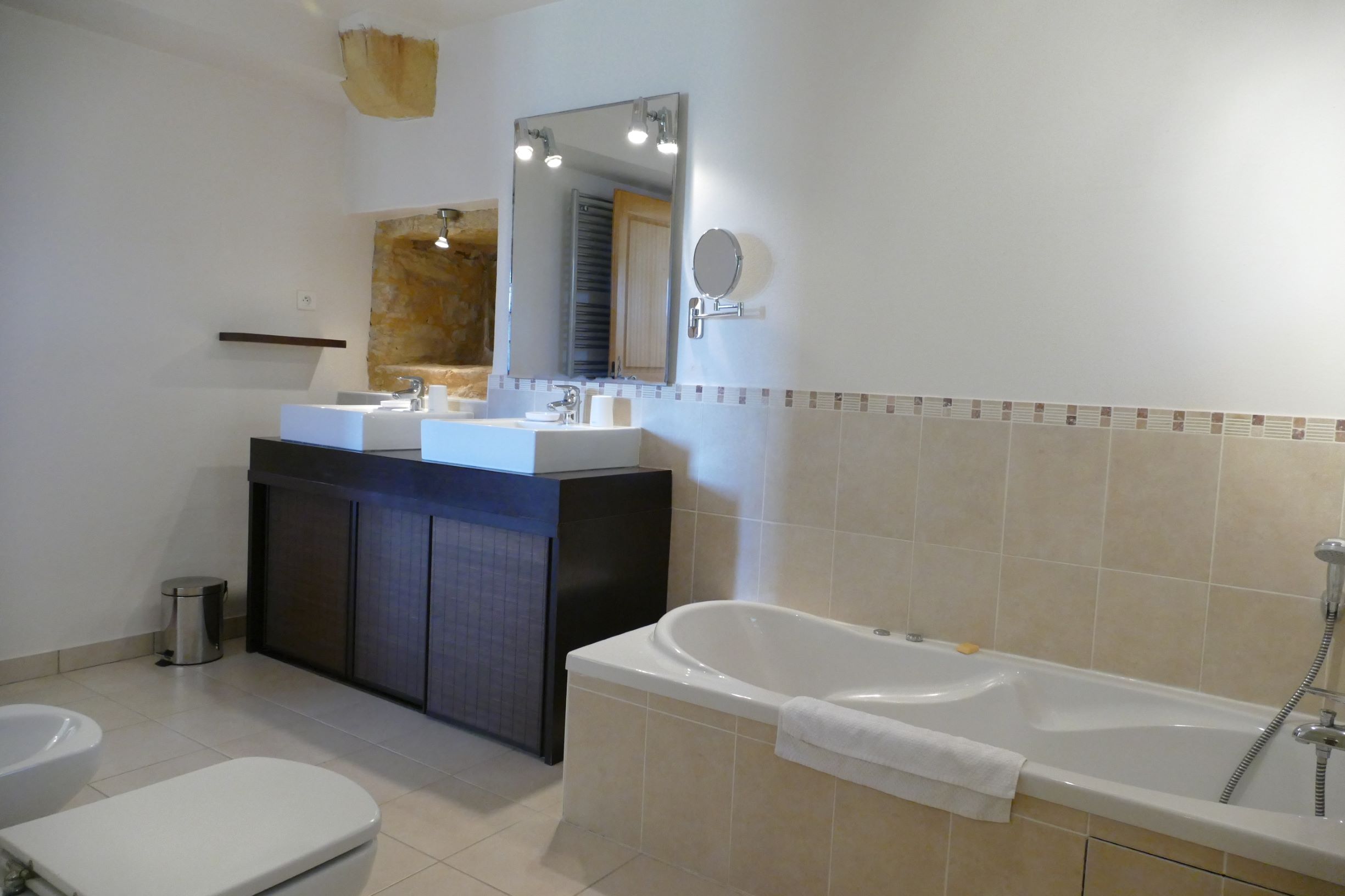 - Salle de bains en suite : une baignoire balnéo, une douche à l'italienne, un meuble double vasque avec placards, toilettes, bidet et sèche-serviettes