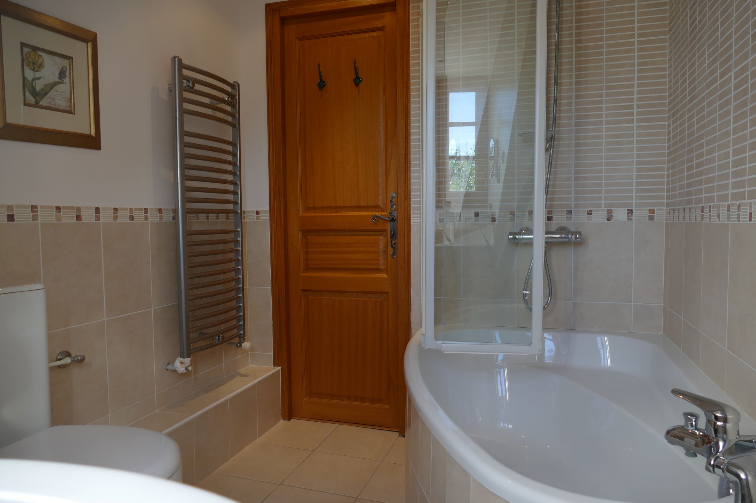 - Salle de bains - Baignoire avec douche et pare-douche, meuble vasque, WC, sèche-serviettes, miroir