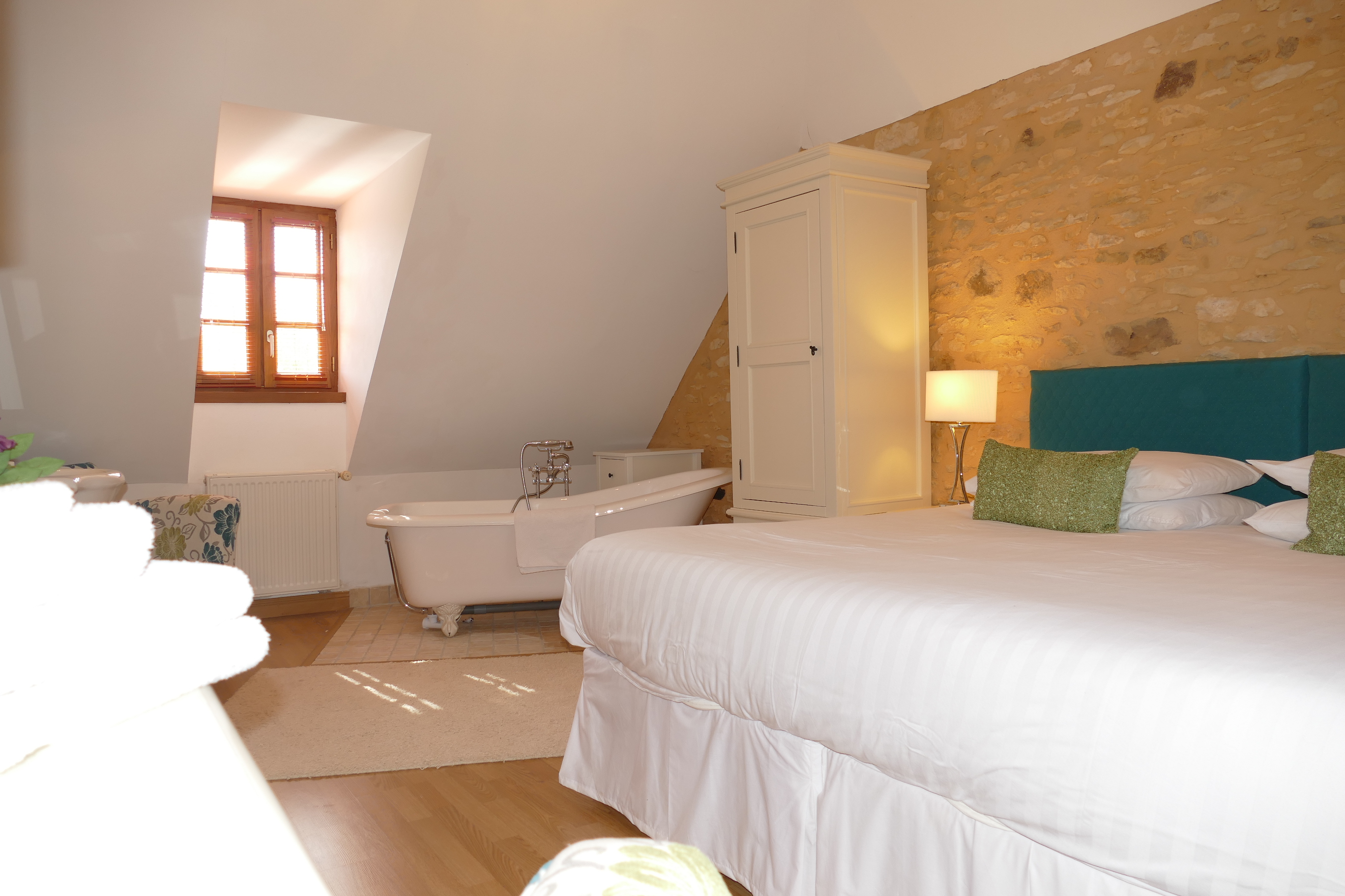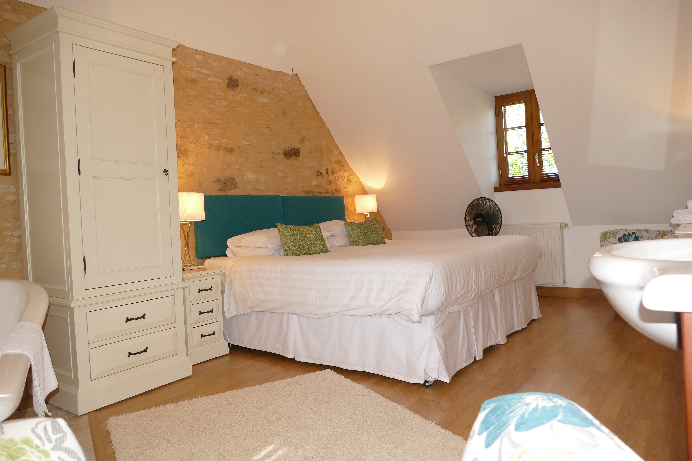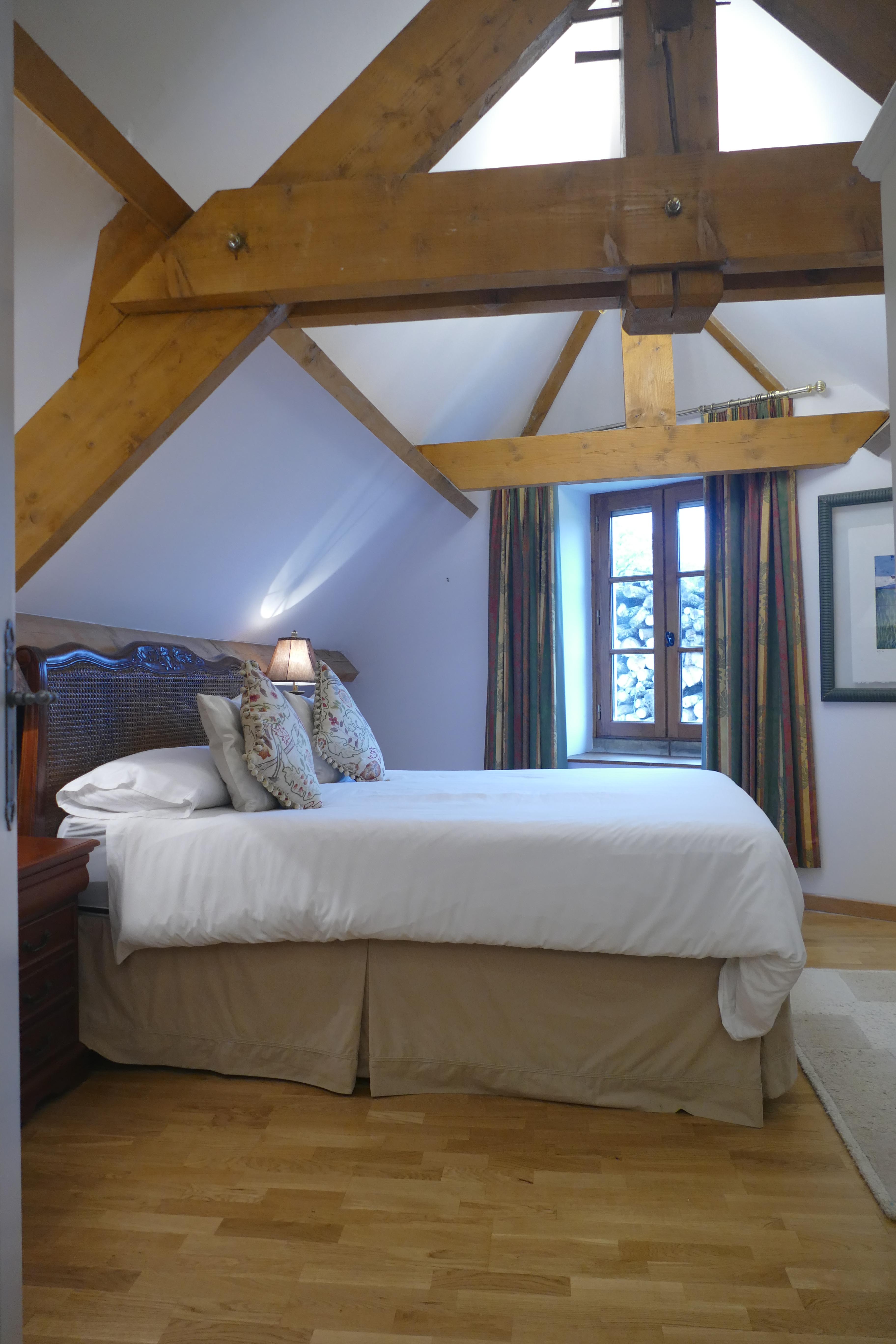 - Chambre 5 – (Baignoire autoportante et meuble vasque dans la chambre) – Lit Super King (180cm), tables de chevet, armoire, commode, fauteuil, 2 fenêtres et ouverte sur les chevrons, mur en pierre., miroir, ( NB Cette chambre peut être aménagé en chambre twin)